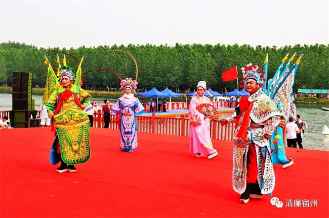 泗縣端午龍舟比賽開幕式上,泗州戲《璀璨梨園》在岸邊舞臺綻放,泗縣傳統(tǒng)戲劇泗州戲唱腔圓潤,宛轉(zhuǎn)悠場,聽得人如癡如醉。