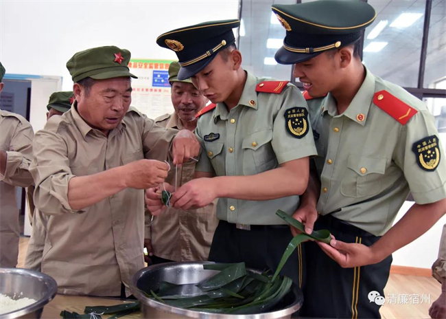 端午前夕,碭山縣武警中隊官兵們帶著粽葉、糯米、紅棗等,到縣光榮院和老紅軍、老兵們一起包粽子喜迎端午,盡享濃情粽意。