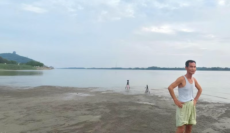 2025年9月11日,愛好延時攝影的馬鞍山市居民周澤正在等待日落時分。(新華網(wǎng)記者李雪芹 攝)