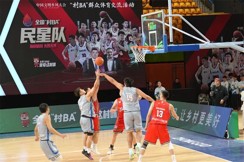 當(dāng)哨聲響起,比賽正式開始。聚光燈下,全國“村BA”冠軍福建晉江隊與全國“村BA”民星隊在攻防轉(zhuǎn)換間展開巔峰對決。在“冠軍隊加油”“民星隊加油”的一聲聲助威吶喊中,一記三分球空心入網(wǎng),一次飛身拼搶籃板,將氣氛推向高潮。