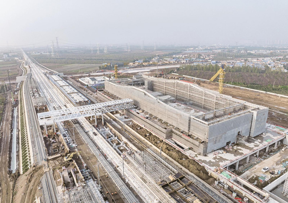 11月11日,航拍正在建設(shè)中的淮蚌高鐵(原淮宿蚌城際鐵路)宿州西站。該站站房混凝土主體結(jié)構(gòu)已于日前順利封頂,站內(nèi)旅客通道、站臺(tái)墻等配套設(shè)施建設(shè)也在高效推進(jìn)中。