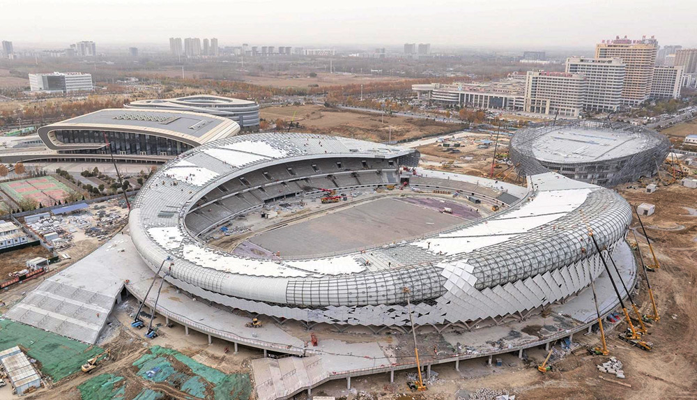 12月2日,記者航拍正在緊張施工中的宿州奧體中心體育場。目前,奧體中心體育場主體結(jié)構(gòu)已基本完工,大樓梯、看臺主體結(jié)構(gòu)澆筑及看臺墻體砌筑全部完成,正在安裝外立面鋁板。作為承擔(dān)省十六運(yùn)開、閉幕式和相關(guān)大型賽事的主場館,該項目建成后,將全面提升宿州市體育賽事承辦能力,為省十六運(yùn)比賽提供優(yōu)質(zhì)的場地條件,引領(lǐng)全民運(yùn)動熱潮,為宿州體育事業(yè)發(fā)展注入新動力。(拂曉報 記者 蘇洋 攝)