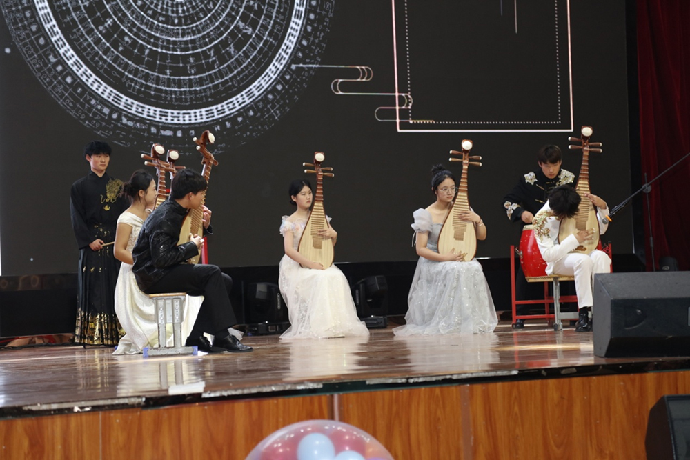 展演現(xiàn)場(chǎng)還呈現(xiàn)了多元藝術(shù)形式的融合之美。李子蒙、陳子然、黃安琪等表演者在《月下剪影》走秀中,以靈動(dòng)身姿展現(xiàn)傳統(tǒng)服飾與非遺元素的雅致結(jié)合;李蓉帶領(lǐng)團(tuán)隊(duì)演繹的舞蹈《華韻滿堂》,用翩躚舞步勾勒中華傳統(tǒng)文化的博大精深;顧小梅、王玉萍等4位老師聯(lián)袂帶來的靈璧大鼓與琴書《多彩家園》,鏗鏘唱腔與悠長(zhǎng)韻味巧妙結(jié)合,訴說靈璧的風(fēng)土人情與家國(guó)情懷;閆子昊、龔夢(mèng)藝等同學(xué)的琵琶合奏《楚漢驕雄》,弦音流轉(zhuǎn)間重現(xiàn)楚漢爭(zhēng)霸的豪情壯志。