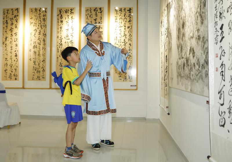 游客在水墨圣泉書畫街區(qū)欣賞書畫展覽。 孫峰 攝