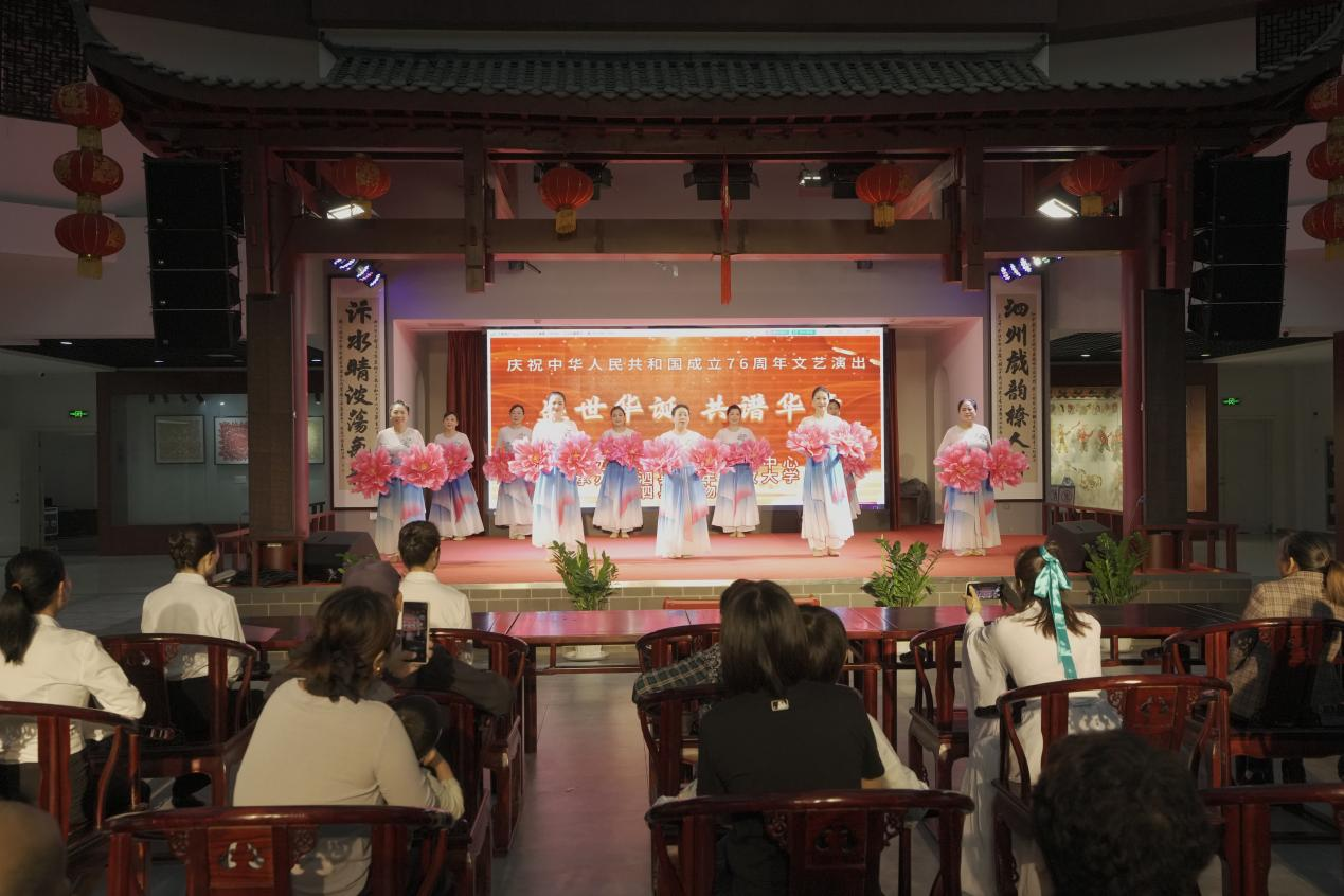 10月1日上午,博物館三樓多功能廳早已座無虛席,“盛世華誕 共譜華章”國慶專場演出拉開系列活動的序幕。由縣博物館與老年開放大學(xué)聯(lián)袂打造的節(jié)目亮點紛呈:開場舞《花開中國》裙擺翻飛間盡展山河壯美;漢服走秀《杏花落又開》中,身著襦裙的表演者緩步而行,與畫像石上的漢代人隔空“對話”;當(dāng)《我和我的祖國》旋律響起,老年學(xué)員手執(zhí)紅色捧花起身合唱,臺下觀眾自發(fā)跟唱,歌聲與掌聲交織成最動人的家國頌歌。