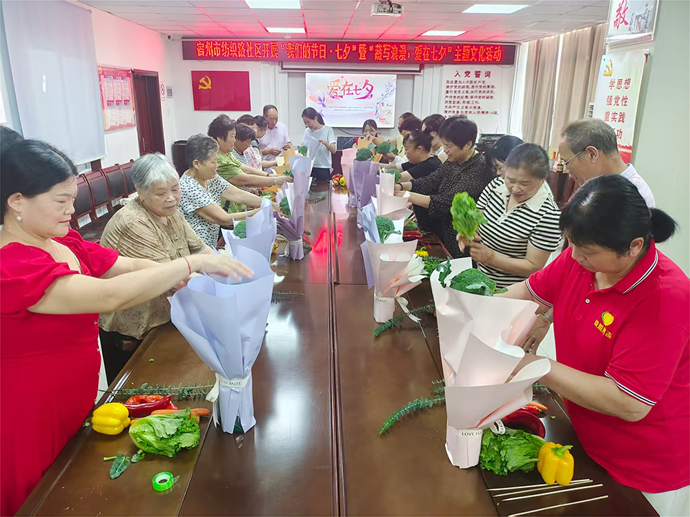 8月29日,埇橋區(qū)三里灣街道紡織路社區(qū)開展“我們的節(jié)日·七夕”暨“蔬寫浪漫,愛在七夕”主題文化活動。居民們通過合作完成果蔬花束、創(chuàng)意拼盤等環(huán)節(jié),在溫馨互動中感受節(jié)日氛圍,增進夫妻感情與鄰里情誼。
